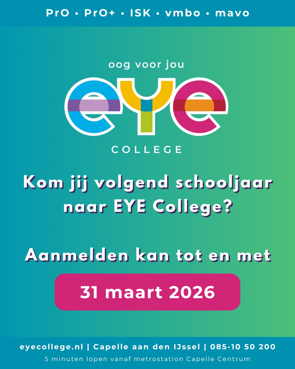 EYE College is een fijne, gezellige school. Samen met je klasgenoten leer je over de wereld, over jezelf, en over wat jij interessant vindt. Wij helpen jou stapje voor stapje op weg naar je diploma. Heb je een advies voor vmbo, mavo, PrO, PrO+, of ISK, dan zijn wij de school voor jou!